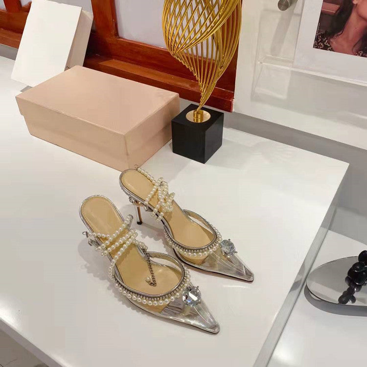 Pointed Toe Toe Stiletto Heel Pearl One Word Belt Fashion Women's Sandals